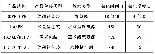 表一 軟包裝常用產品的熟化溫度和熟化時間